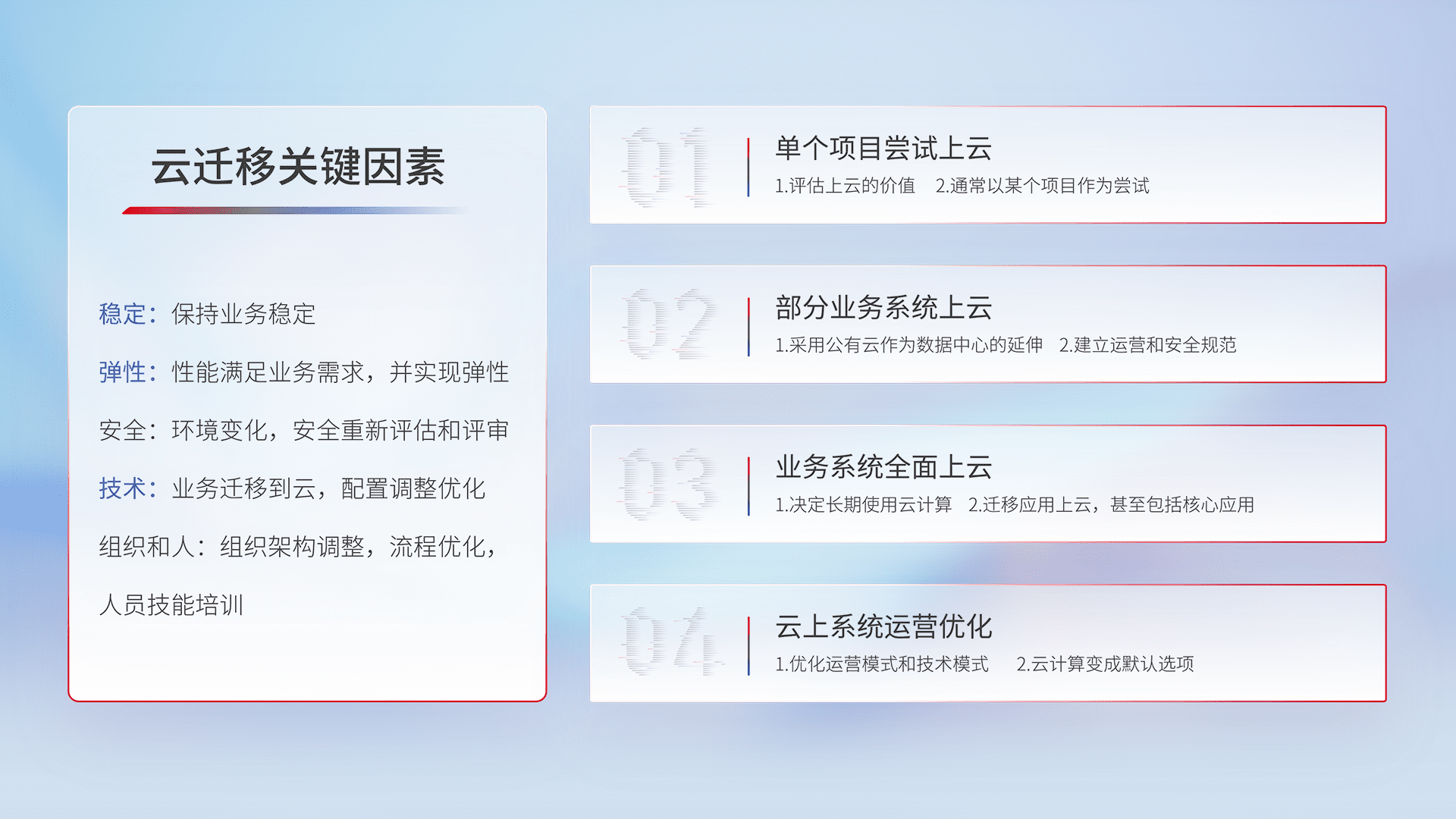 结合实际业务,,从规划设计、、、、云平台选型、、、、云原生改造、、数据迁移、、、、集成交付,,,,迁移全过程为客户识别最佳上云路径,,,做好风险识别管理,,,设计网络架构、、、、身份权限、、、安全审计合规、、操作审计、、、、日志审计、、、、监控告警策略、、、多站点容灾设计等,,对云上基础设施进行整体规划,,提升IT治理水平,,,以满足弹性、、、高可用、、高性能的需求。。。。