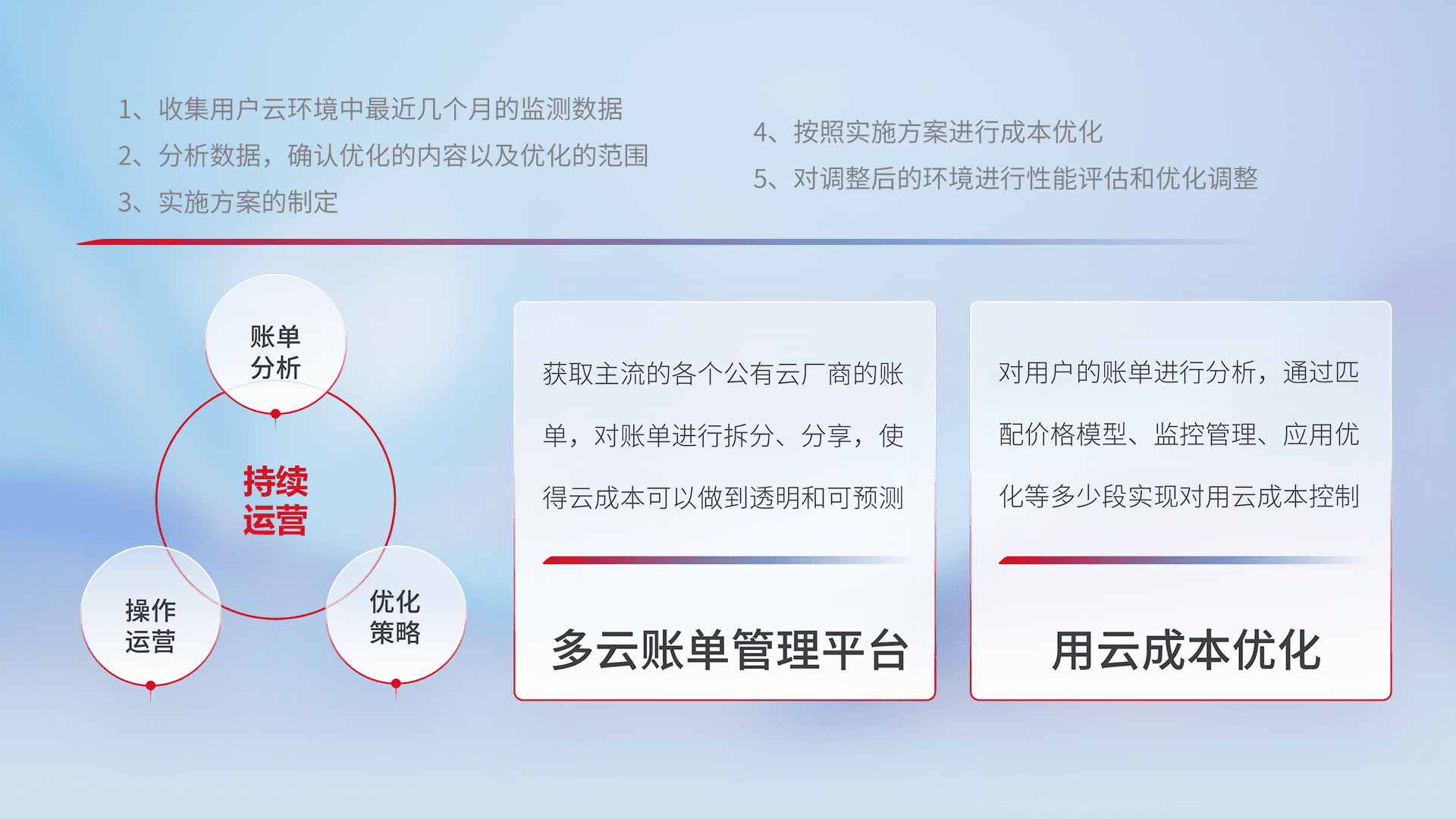 通过多云纳管,,,以统一的资源数据模型把客户的云资源进行抽象和封装,,,进而实现对多云资源的统一操作,,,,保障云资源管理的可靠性、、稳定性与可用性。。量身定制化运维内容,,,,配置、、、、开发运维、、补丁管理、、备份、、监控、、认证和访问管理、、、、审计和日常巡检等,,保障在用云过程中的可靠度,,稳定度以及高可用率。。。。