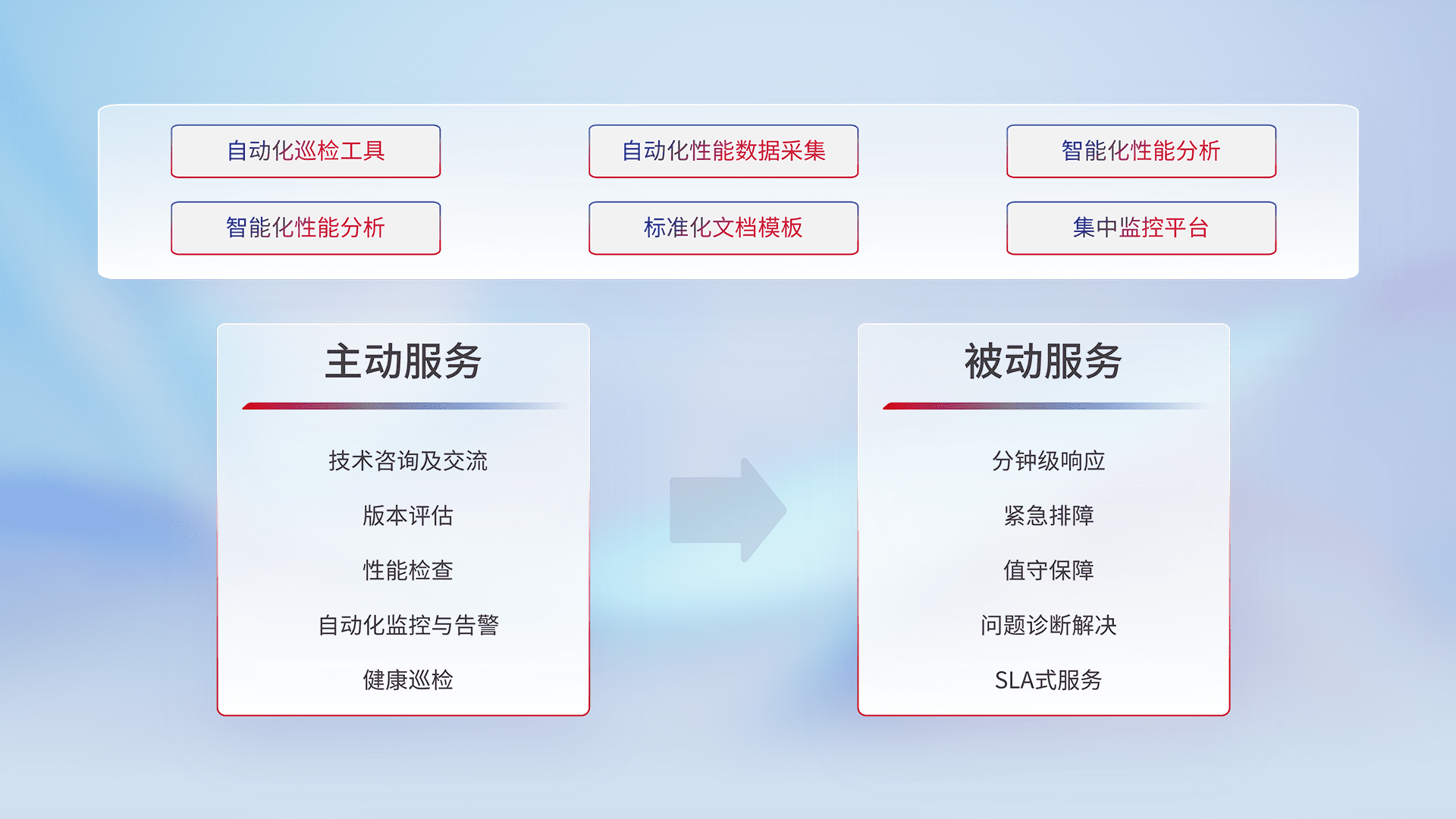 智能化工具和标准化文档,,,保障服务质量,,,提供主动服务(包含技术咨询、、、版本评估、、性能检查、、、自动化监控与告警、、、健康巡检)和被动服务包含(分钟级响应、、、、紧急排障、、、值守保障、、、、问题诊断解决、、SLA服务)。。。。